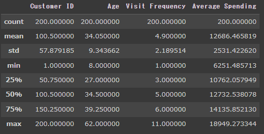 # 顧客データ: 年齢、来店頻度(年)、平均支出額