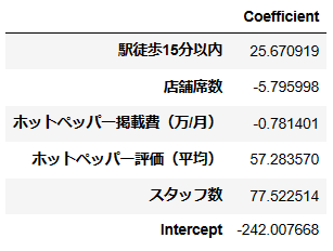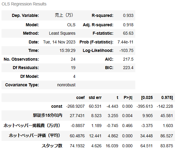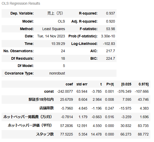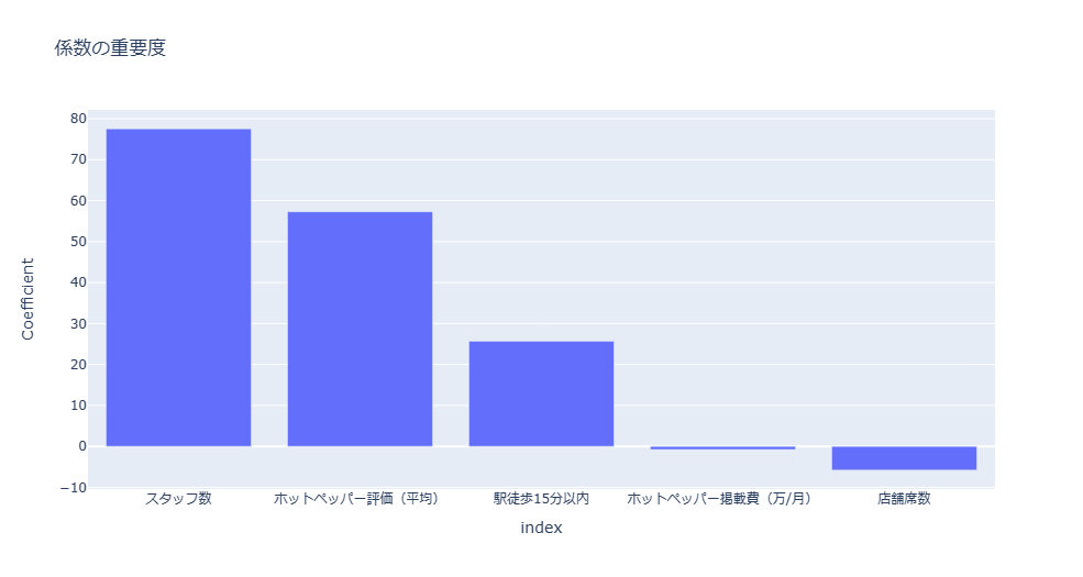 これを見ると、駅徒歩15分以内、ホットペッパー評価、スタッフ数の3つが売り上げに対してプラスに働いているようです。
