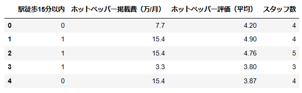 X_modified = df[['駅徒歩15分以内', 'ホットペッパー掲載費(万/月)', 'ホットペッパー評価(平均)', 'スタッフ数']]